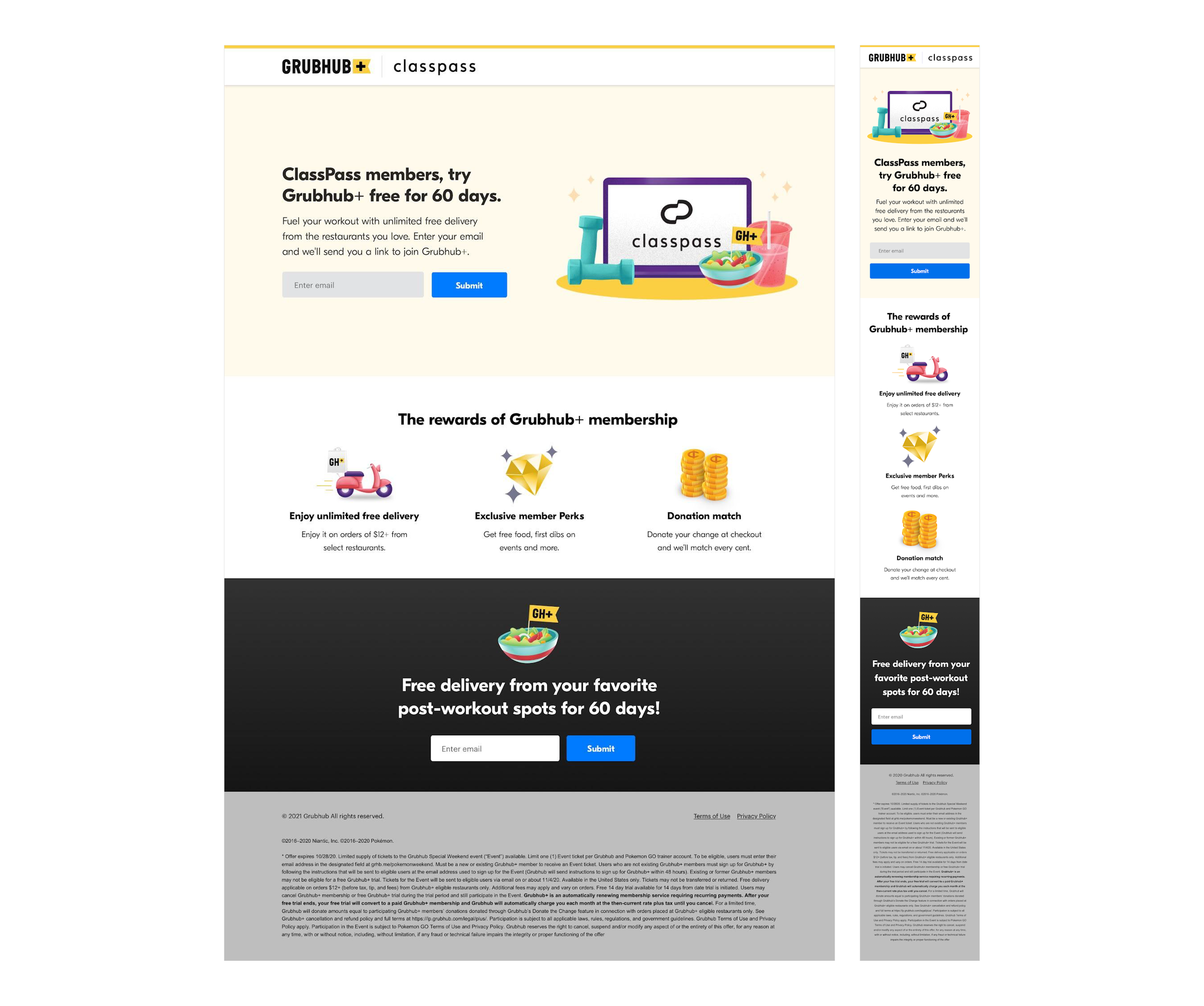 Landing pages for Grubhub+ | classpass: Desktop and Mobile